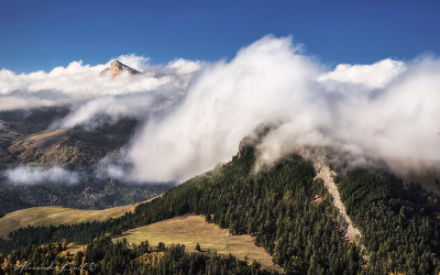 Облака атакуют Карачаево-Черкессия, начало октября на западных склонах хр. Шантацара. Облака широким фронтом ползут вверх вдоль ущелья Большой Лабы, завихряясь, трансформируясь, сталкиваясь с преградами на своем пути. Уже и от горы Дженту (2888 м.) осталась видна лишь одна вершина. Небольшой таймлапс с этим сюжетом здесь - https://vk.com/wall8008405_3533 |