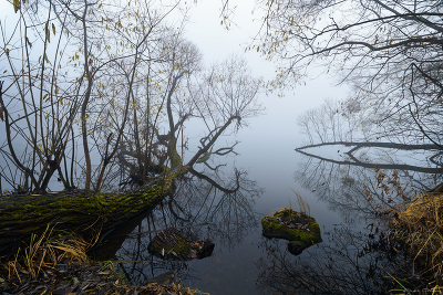 Утро. Густой туман скрыл первые лучи солнца. Воздух застыл над водой...