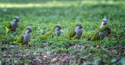 Квакеры в основном обитают на деревьях, но утром ,когда земля влажная от росы или полива, они спускаются на землю в поисках чего-нибудь вкусненького.