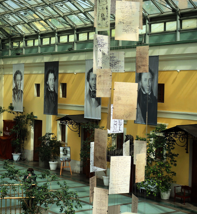 , Гигантские портреты в фойе музея, был ещё больше один. Мне понравилось, как с небес нисходят его рукописи