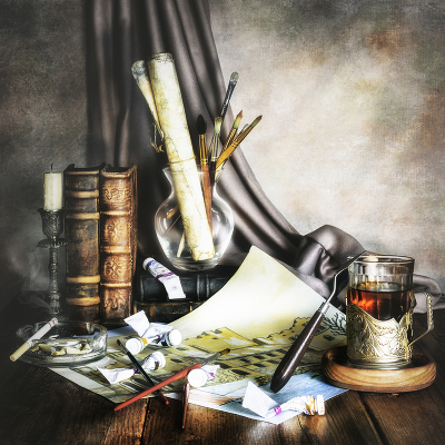 К чаю прислонился мастихин? Почти соприкасается свеча с корешком книги, хотя и видно что подсвечник немного впереди. Нравится сюжет и многопредметность