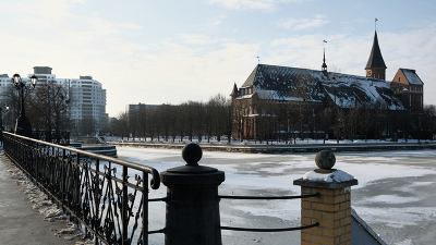 Кафедральный собор на о. Канта Калининград. Вид на Кафедральный собор с "Деревянного моста". Кафедральный собор (До́мский собо́р Богома́тери и Свято́го Адальбе́рта) датой завершения строительства которого считается 1380 год, построенный в стиле кирпичной (балтийской) готики. Службы в соборе не проводятся, здание используется для размещения музейных экспозиций и проведения концертов. На правом углу, обращенном в сторону моста виден открытый колонный зал, внутри которого стоит каменный гроб, который является кенотафом останков И. Канта, но сами останки покоятся немного глубже. |