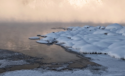 Камни у воды превращаются в снежные плюшки!