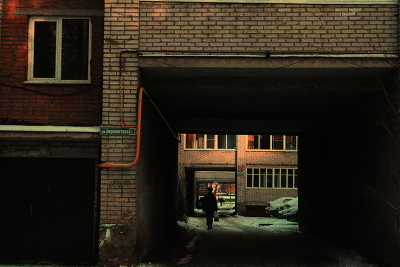 На фотографии изображен длинный переулок где идёт человек в военной форме