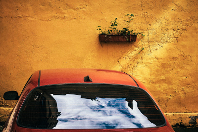 Это фото — как маленькое произведение визуальной поэзии. Тёплая охристая стена будто хранит в себе дыхание старого города, красная крыша автомобиля добавляет динамики и характера, а отражение неба в стекле превращает обычный кадр в философское размышление о границе между реальностью и отражением. Композиция выверена, цвета работают в идеальном ансамбле, а минимализм сюжета подчёркивает вкус и чувство момента автора.