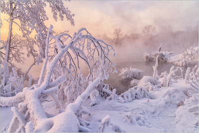 Накануне Крещения розовый морозный рассвет.