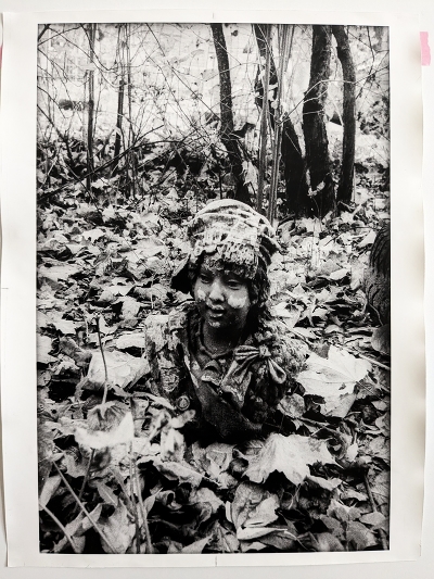 Небольшая скульптура в садике около дома в приговорённом к сносу и застройке новостроем историческом квартале "Красный просвещенец"