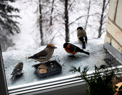 Я тоже кормушку прозрачную на оконное стекло повесила, прилетают снегири и синички. Для моих кошек это сериал на каждый день)