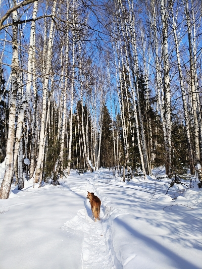 Прогулки в зимне-весеннем лесу с собакой в солнечную погоду.