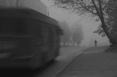 Нравится динамика, которуя создает в кадре автобус. Причем все движение направлено в сторону фигуры человека, которая очень удачно расположилась в кадре, создавая композиционный центр фотографии. Композиция далеко не идеальна - автобус излишне массивен - но даже при этом кадр выглядит интересным. Как вариант кадрирования -