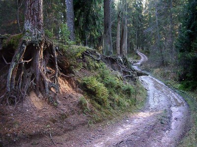 Вымыта почва. Напоминает "ходульные деревья" на Байкале. Но там на песке... )