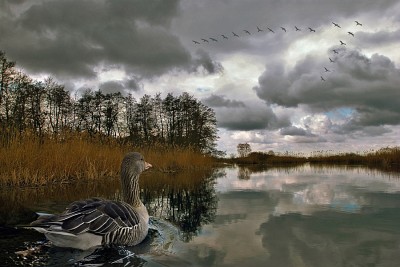 Яков Лесной, а вы читали Серую Шейку, там сказочка про уточку, а здесь огромный гусище. Эту картинку надо назвать и тут пришел Серый гусь и сожрал бедную уточку.?