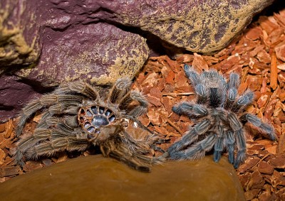 покидая своё тело... странная история первой линьки недавно купленного паука... Утром был обнаружен в судорогах на спине,морально с ним простились,а вечером застали картину второго паука. Он невероятным образом вылез из прошлого тела и сидел рядом такого же размера.Для неопытных пауководов зрелище удивительное... |