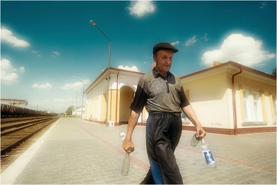 Спасибо всем за внимание к фоте. Это рабочий железной дороги идет себе такой довольный в обеденный переыв за квасом