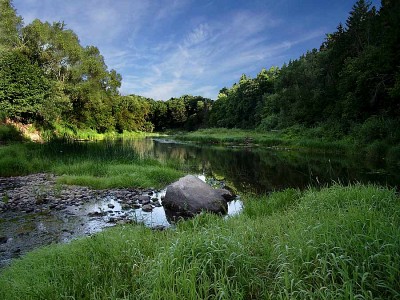 Камень убирать не надо, он как раз создает глубину, а вот если траву закропить хотя бы до начала воды , то он начнет работать лучше. И даже ничего, что он в центре. Симметрия м\у небом и травой переднего плана видна только в ч\б, если поиграть с каналами.