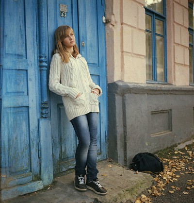 Девушка,синяя дверь,осень.
