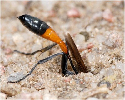 Аммофила #2 Не сразу я замечаю, что она сидит совсем рядом с норкой – ни песчинка, ни ямка, ничто не выдает строительных работ, крошечная дырка практически незаметна в земле. Но вот короткий отдых подошел к концу, оса вновь принимается за работу. Она ныряет в норку, которая еще не слишком глубока, и брюшко торчит наружу. |
