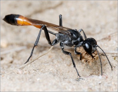 Аммофила #3 Несколько секунд, и оса появляется на поверхности с комочком песка, крепко зажав его между подбородком и передними ногами. Вот почему поблизости не видно следов строительства – аммофила взлетает и сбросывает груз на некотором расстоянии от норки. Очень предусмотрительно – ничто не выдаст врагам, где именно выкопано гнездо этой осы. |