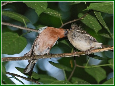 Птенец зяблика на веточке терпеливо ожидал, когда родитель принесет очередную порцию корма. Вот наконец-то и долгожданный корм...