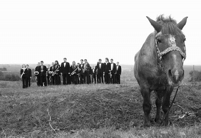Репетиция оркестра в чистом поле на фоне пасущейся лошади ...