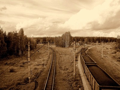 поезд Россия, Екатеринбург. 1км от ст. Лечебный, вид с моста через железную дорогу. Съемка "с рук". Горизонт специально "завален" вправо на 0.75 градуса - так, на мой взгляд, больше чувствуется движение поезда. Поезд и ж/д дорога весьма интересно смотрятся на фоне природы. |