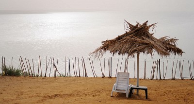 Мервое море, 6 часов утра, пустынный пляж и одинокий лежак.