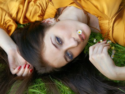 Да, много цветовых акцентов заставляют метаться взгляд по снимку. Голубые ресницы, трава, ногти, кофточка. А что если в ЧБ попробовать