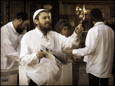 не проходите мимо! Уличный пункт благотворительных пожертвований от граждан светских - гражданам религиозным. Этот ортодокс, похоже, потерял всякую надежду заинтересовать хоть кого-нибудь из прохожих своей брошюркой... |