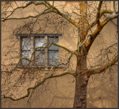 Когда обрабатывала, показалось, что дерево обволакивает это окно, причем обвалакивает очень мелкими, цепкими ветками. По-женски обволакивает, присваивает. Получается, дерево - это женщина. А окно такое простое, прямолинейное, всего три мылси в голове - это мужчина (пусть мужчины не обижаются, это образно). Если выразиться емко, то здесь изображено присвоение женщиной мужчины.