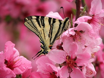 Бабочка махаон (подалирий) на цветущей ветке персика