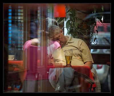 , Небольшое кафе на тротуаре, пристройка к основному кафе, типа аквариума с элементами отделки, человек внутри, дама снаружи, пере отражение. Один из любимых видов съемки - отражение и пере отражения
