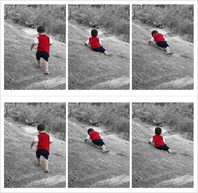А зачем второй ряд- верхний вроде лаконичней один и сюжетно более читаем- взобраться на гору, шлепнуться, не расплакаться, а найти в себе силы подняться к цели. Нижний ряд более писсимистичный- Взобраться на гору, шлепнуться и безысходно посмотреть вверх на несбывшуюся мечту...