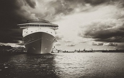 Корабль выглядит монстро-образным, заслоняя город.