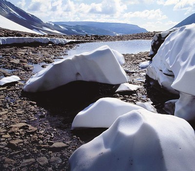 , Там никто не живет. До ближайшего нас. пункта три дня пути. Летом там очень красиво и тепло. Снежники не успевают растаять, потому что снег чистый и отражает тепловые лучи. В день съемки этого кадра температура воздуха была +32 по Цельсию.