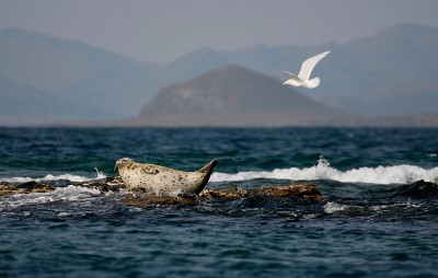 Это тюлень - ларга. Или нерпа. Это его обычное состояние- или плавает, или лежит на солнышке. Где снимали. Владимир?? В заповеднике?? на камнях Бутакова?? Котики в Приморские воды заходят очень редко,но встречаются. У нас для них слишком тепло.