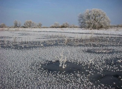 Зимний паводок на Полесье Вода на разливах превысила уровень весеннего паводка. Фото сделано на острове в пойме, но и сюда ворвалась вода, образовав среди острова озеро. Морозы последних дней сковали все льдом. |
