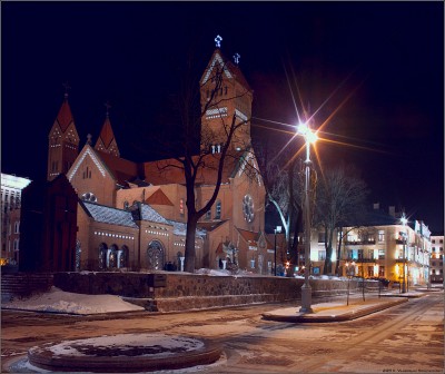/ Красный костел / Наиболее известный католический храм Минска – Костел святых Симеона и Елены (Красный костел). Построен в новороманском стиле, в нем соединены мотивы романской и готической архитектуры. Благодаря красному «модерновому» кирпичу, из которого он сложен, минчане называют его «красным костелом». Это не просто храм. Это памятник Сымону и Елене – умершим детям Эдварда Войниловича и Олимпии Узловской. ISO200, AV /f8, TV 5 сек, 14.02.2011 20:25  |