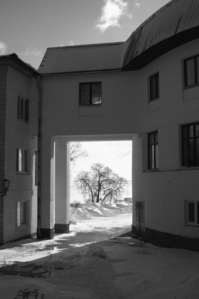 По всей видимости темное царство надо взять в кавычки. Дело в том, что это практически северная сторона санатория, и только летом, когда солнце в зените, там более менее светло, а все остальное время - темно. Но даже летом, эта арка своего рода "рубикон", граница. Зашел за нее и ты в лучах солнца, в тепле., вернулся назад - снова темно и "холодно".