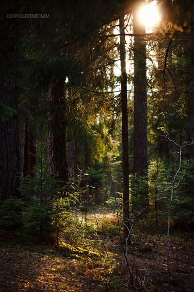 солнце упирается в верхний край кадра - не есть гуд. Нмв, нужно было непременно снимать шире, если кадр кадрировался, то напрасно, или можно было хотя бы пару вертикальных кадров сделать. Сухие ветки мне нравятся, но что бы они были на заслуженном месте, надо было бы пару шагов назад еще сделать. Как свет лег в глубине леса нравится, удачно получилось.