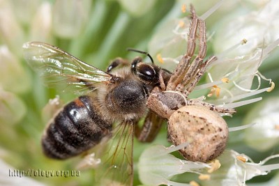 Паук долго сидел в засаде внутри цветка лука, пока ему в "зубы" не попалась пчела