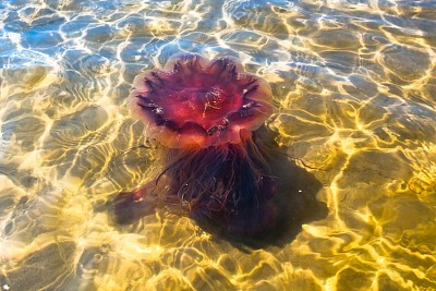 Белое море и его обитатели Арктическая цианея — самая крупная медуза Мирового океана. Встречаются экземпляры с диаметром купола, достигающим 2 м. Щупальца таких крупных экземпляров способны вытягиваться до 20 м. Обычно цианеи не вырастают больше 50—60 см. Я видел медуз диаметром не более 40 см, но их было МНОГО! |