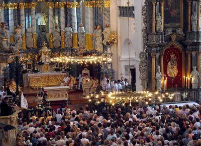 Открытие после восстановительных работ и освещение алтаря Фарного костела в Гродно