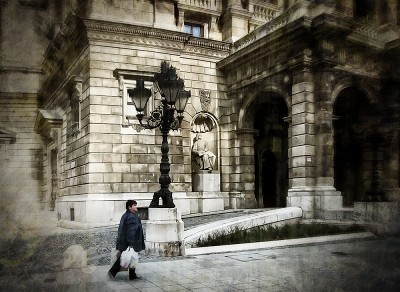 Нравится, что окошечко синее наверху, перекликается с курткой дамы... Да, посмотришь на эту картину, и вздохнёшь - как омужичились многие женщины... Не одежда, а униформа какая-то, бесполая... И такой контраст - между красотой здания и этой спешащей современной матушкой с пакетами... Словно попала она сюда из другого времени...