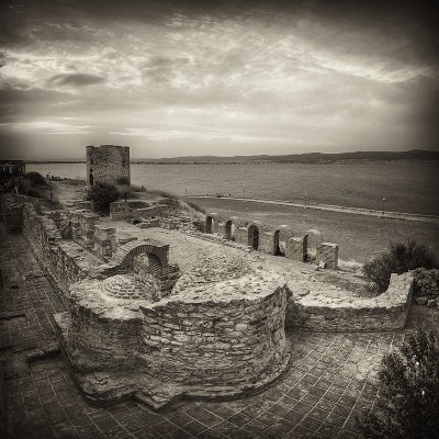 Света Богородица Елеуса-Несебър Несебр, Болгария. На преднем плане церковь Божией Матери Елеуса (трехнефная базилика, 3 апсиды и притвор, длина 28 метров, широта-18). Построена в VI веке! В притворе есть гробницы. На заднем плане руины ветряной мелницы. |