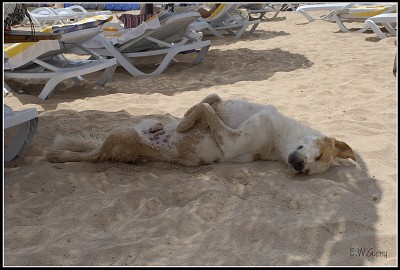 Собачья жизнь... На пляж прибегает собачка (хотя это неположено в районе отелей), забегает в море по брюхо, хлебает немножко водички, выбегает из воды, находит тенек от зонтика и заваливается брюхом кверху... что Вы и видите |