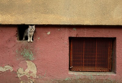 Объект из отсутствующей штукатурки внизу слева ещё на превью ассоциирует с головой Ленина, на которой сидит ещё один бирюзовый кот.
