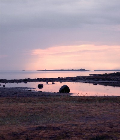Переменчивая погода севера. Стена дождя оступает влево в море, уступая вечернему солнцу