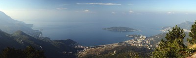 Будванская ривьера Вид с горного массива, нависающего над Будвой. К сожалению, не удалось поймать абсолютно прозрачную атмосферу (были там в эту поездку только один раз), поэтому за дымкой не самый лучший вид. Но место в самом деле прекрасное... Внизу (слева направо): остров-отель Св.Стефан, Рафаиловичи, Бечичи, о. Св. Николай, Будва. Склейка из 5 фото. |
