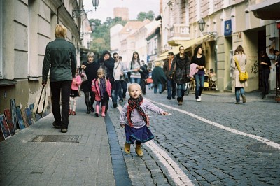 Ракурс просится еще ниже. Цвет сыграл злую шутку (розовые куртки и желтая сумка перетягивают на себя больше внимание). Слишком много народа - предлагаю сделать главного героя весомеее