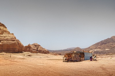 Блага цивилизации. Семейное фото. В голой пустыне у весьма не бедного бедуина, имеющего свои "кафе", в которых кормят туристов и парк строительной техники, живут три семьи. Жены располагаются друг от друга в радиусе, примерно, километра. И дети и жена обитают вот в таких лачугах. Дети за проволочной оградой. Ещё в этой хибаре с ними обитает ишак. Вот такая цивилизация в 2011. |